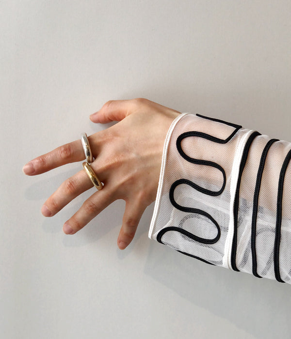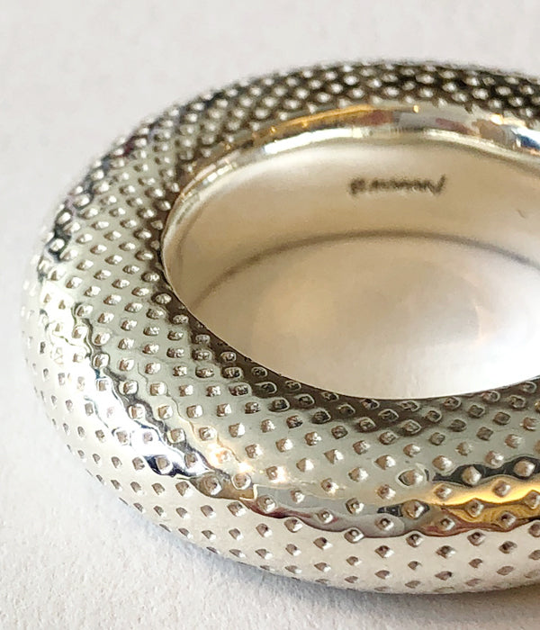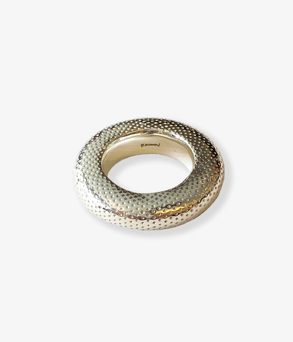 R.ALAGANからKOMON RINGが入荷しました。日本の伝統柄"小紋"を施したオールラウンドリング。ボリューム感のある見た目ながら重くなく、指に当たる部分は鏡面仕様で滑らか。圧倒的な存在感でリングは潔く一つだけ、というのもおすすめです。