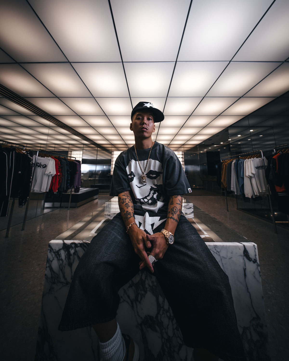 SAINT MICHAELから、BAPE_SS T-SHIRT/ALWAYS LOVE/BKが入荷しました。©SAINT MxxxxxxとA BATHING APE®のコラボレーションアイテムを2月7日(土)に発売いたします。今回、アパレルからライフスタイルグッズまで、幅広いラインアップを展開。BAPE®のアイコンを起点に、©SAINT Mxxxxxxのフィルターを通して再構築し、両ブランドの世界観が交差するアイコニックなコレクションが完成しました。ビジュアルモデルには両ブランドと親交の深いアーティスト・JP THE WAVY氏を起用。BAPE®原宿店にて、フォトグラファーのRK氏が撮りおろしました。