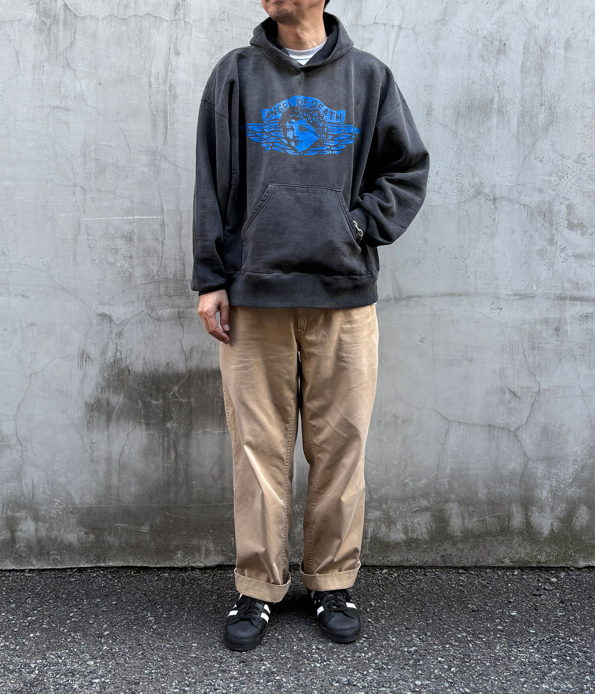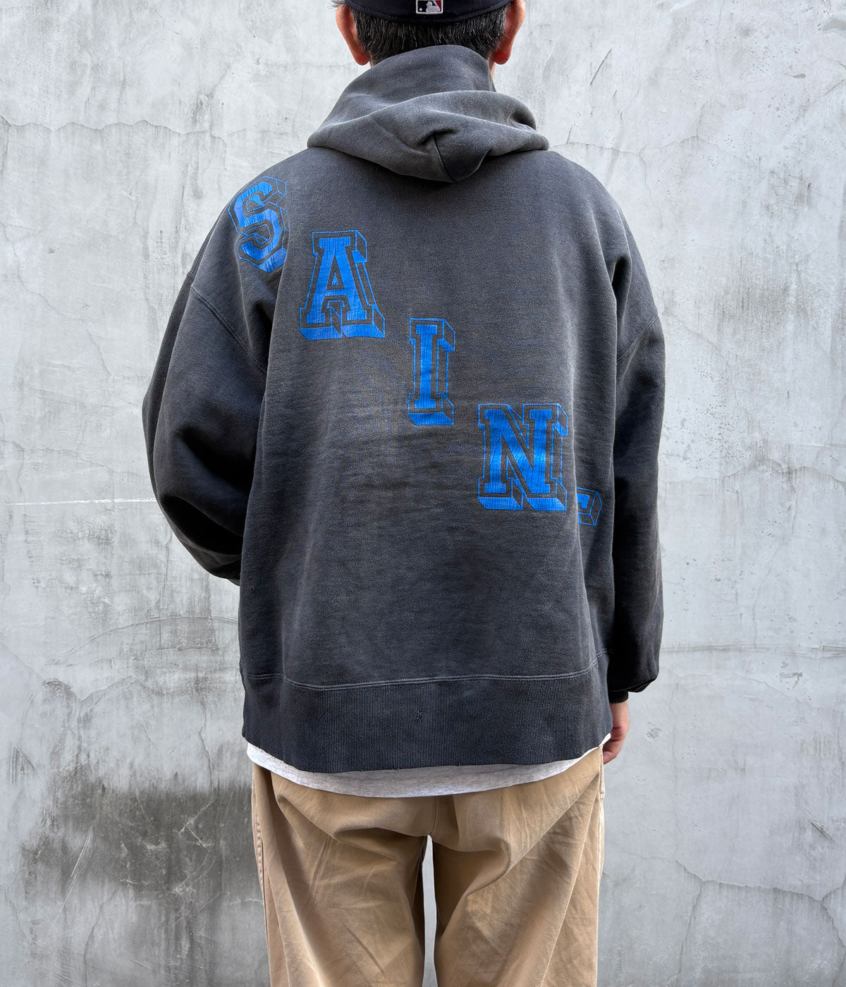 SAINT MICHAELから、HOODIE/ANGEL/BLACKが入荷しました。フェード感に溢れる墨黒色のボディにビンテージ感が宿るP/Oフーディー。前後に青で大きくデザインされたプリントがインパクトあります。バックスタイルでななめにデザインされたSAINTの青字がポイント。