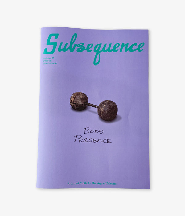 Subsequence Magazineから、volume 05 2022-1stが入荷しました。今号のテーマは「Body Presence(ボディ・プレゼンス)」。移動が制限され、日常のあらゆる行動がオンラインやリモートによって簡易に済まされてしまいがちになった今、改めて「実際に体で感じること」の大切さについて考えてみたいと思いました。アーティスト、デザイナー、ミュージシャンなど、多くの表現者に自身の活動や制作物と身体との関わりについて話を聞きました。もちろん今号も世界各地の知られざる工芸や美術、文化をご紹介するコンテンツは大充実。美しいヴィジュアルと詳細なテキストでたっぷりお送りします。