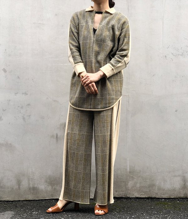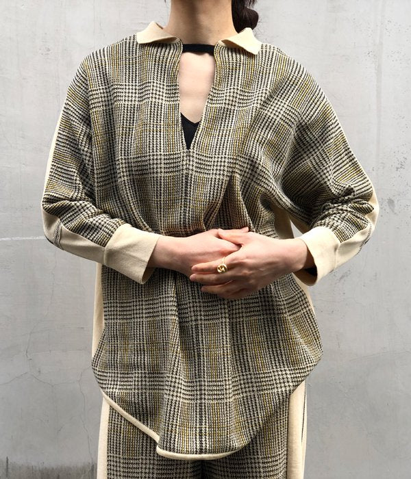 TANからCHECKED & LINE BLOUSEが入荷しました。ハイゲージの細かなチェック柄と、繊細なラインをインターシャで品良く編み立てたニットBLOUSE。リネンやラミー特有のナチュラルカラー、シャリ感が優しい編地の一枚。前後どちらでも着用可能です。