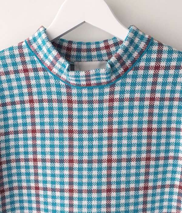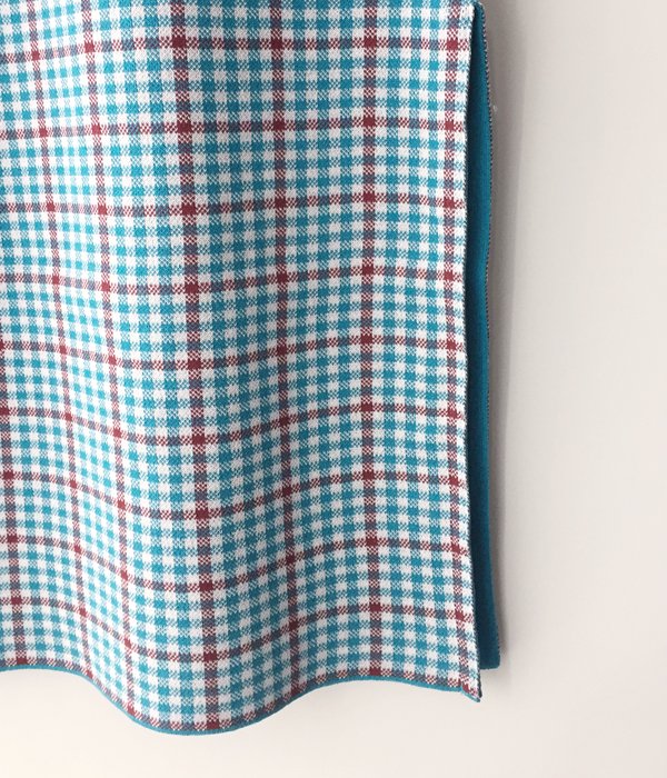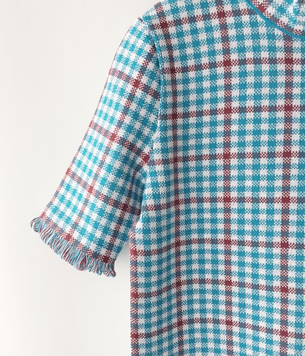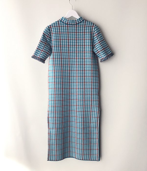 しっかりとした編地のチェック柄ワンピース。少し詰まったネックラインや袖口にあしらわれた繊細なフリンジがポイント。両サイドスリット入りでパンツ等とのレイヤードを楽しめます。同素材のビスチェとのコーディネートもおすすめ。