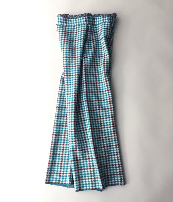 今シーズンらしいカラーのチェック柄ニットパンツ。しっかりした編地で体型を拾いにくい綺麗なワイドシルエット。ウエストには繊細なフリンジが施され、ホック付のフロントは開けて着ることも可能。トップスイン・アウトどちらでも様になる一本。