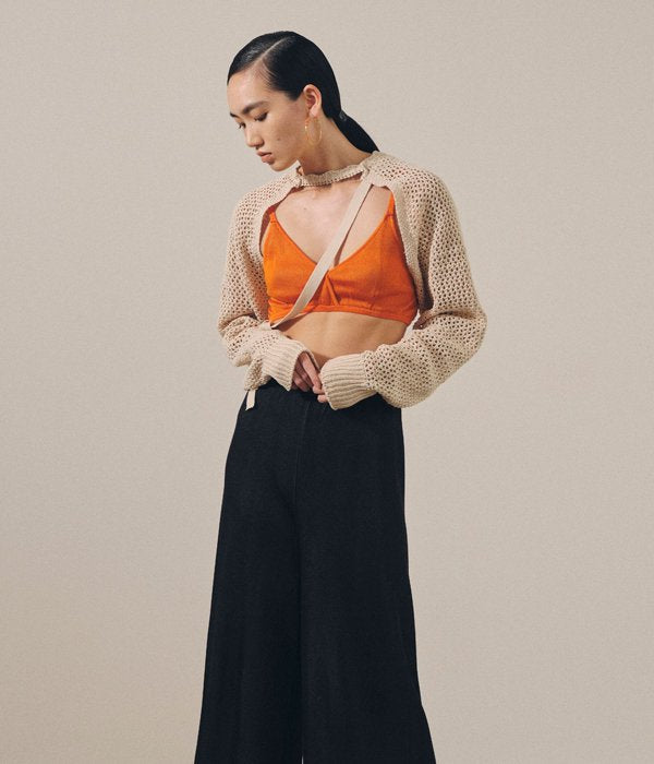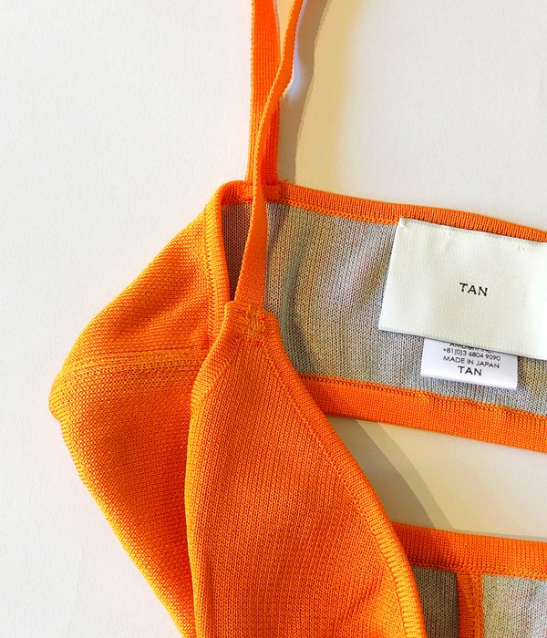 TANからDOUBLE FACE BRATOPが入荷しました。2色のジャガードで編み、重ねた色が透けて見えるような構造の生地を使用。品のある光沢感を持つサラっとした冷感素材で心地良い肌ざわり。裏地は全てサックスブルーで、ネームを外せばリバーシブルでの着用も可能です。