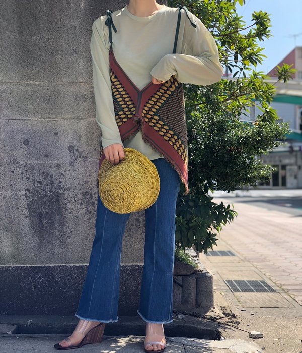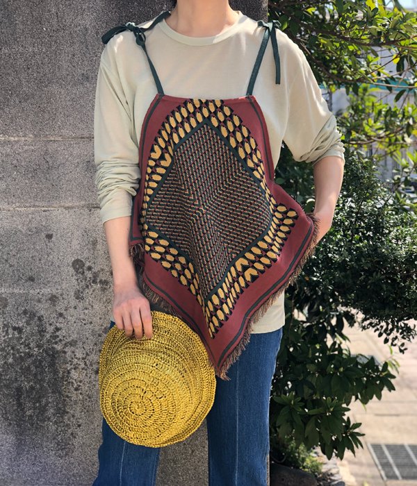 TANからFRUITS JQ HALTER TOPSが入荷しました。フルーツや果実の柄を散りばめ、ジャカードで正方形に編まれたトップス。どこかノスタルジックな雰囲気の色味と柄がコーディネートのアクセントに。肩紐の結び方や長さを変えて色々な着方を楽しめます。