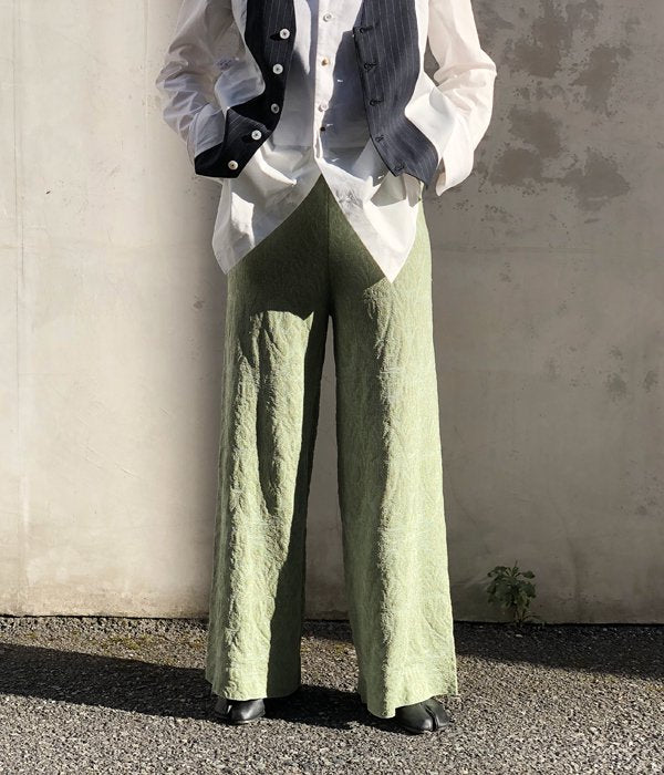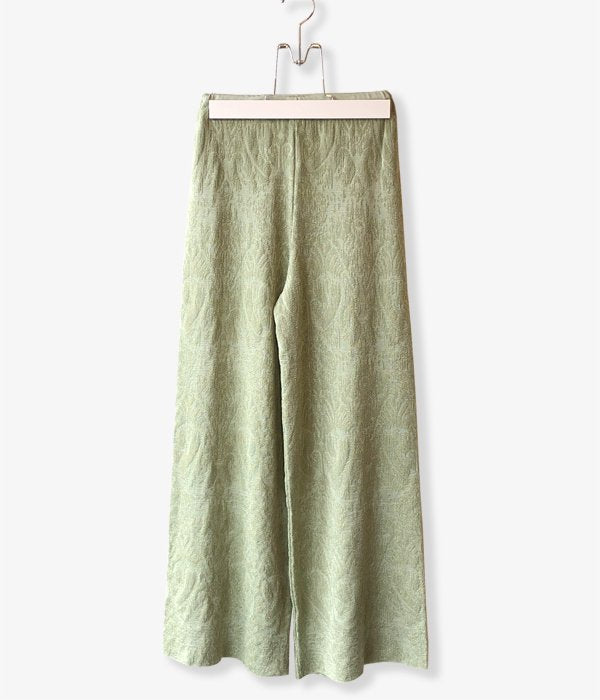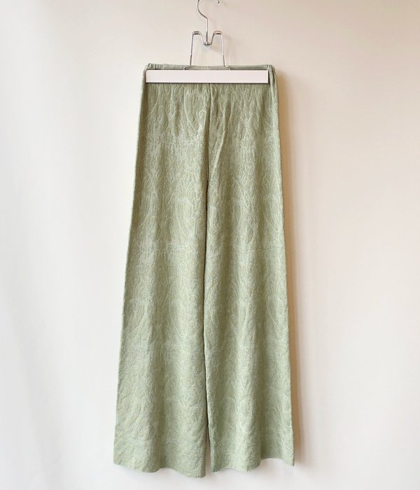 TANからIKAT PATTERN PANTS(MINT)が入荷しました。立体的な表情を見せるイカット柄がポイントのニットパンツ。綺麗な発色と光沢感、ドレープが美しい生地を使用しています。ウエストはゴム仕様、リラックス感がありながら裾に向かってフレアな美シルエットで抜群の履き心地です。