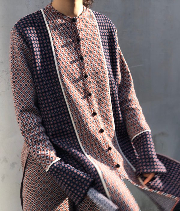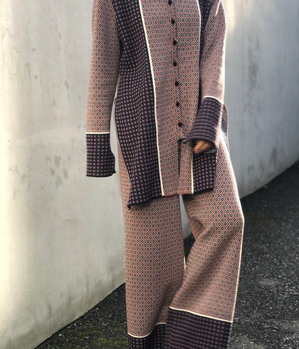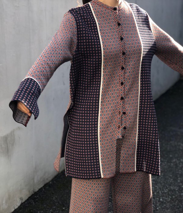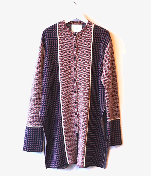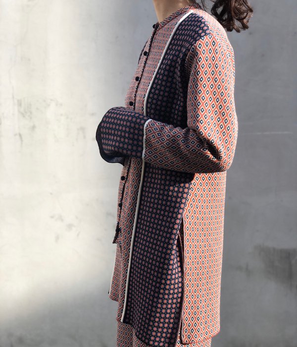 TANからKOMON JQ SHIRTS(DARK ORANGE)が入荷しました。小紋柄をジャガードで表現したコットンニットを切り替え、スリット入りのシャツに。珠状の編込みボタンがオリエンタルな雰囲気を引立てます。同柄のパンツとセットアップで入荷しました。