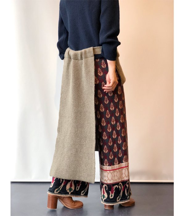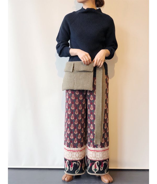 とても柔らかなラムウールを使用のウエストバッグと、エプロンニットがドッキングされたアイテム。エプロンニットは移動と取り外しも可能。他のベルトに通したりなどスタイリングの幅を広げてくれます。意外と収納力のあるウエストバッグもポイント。
