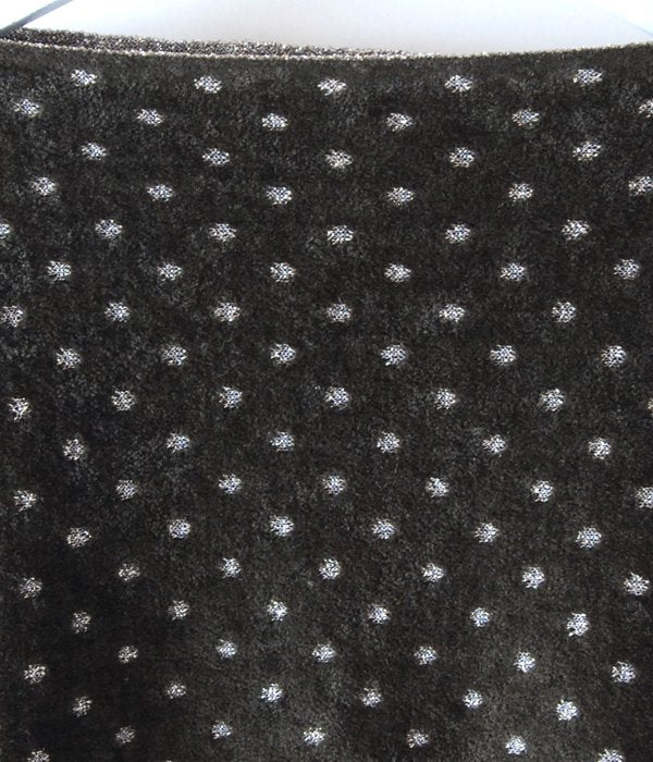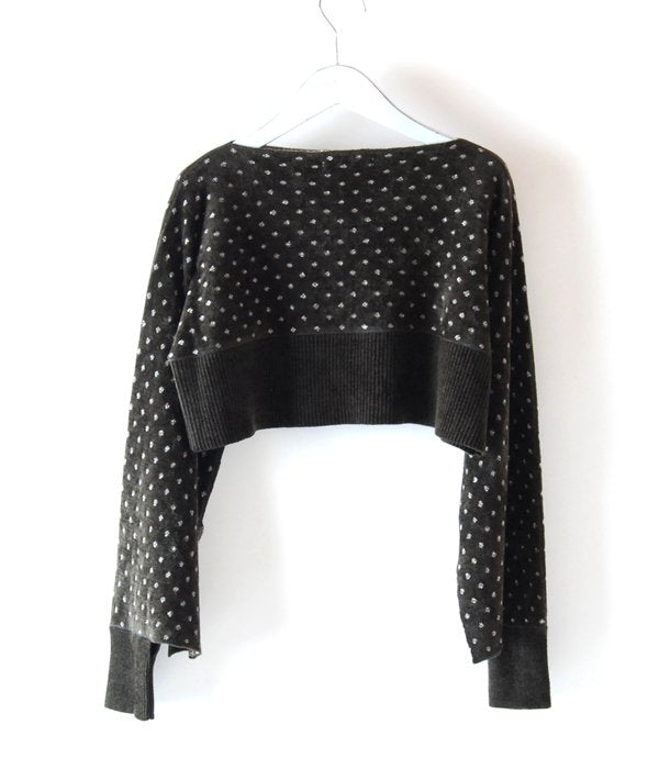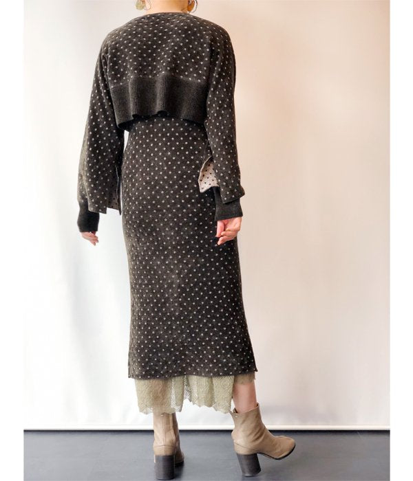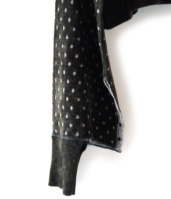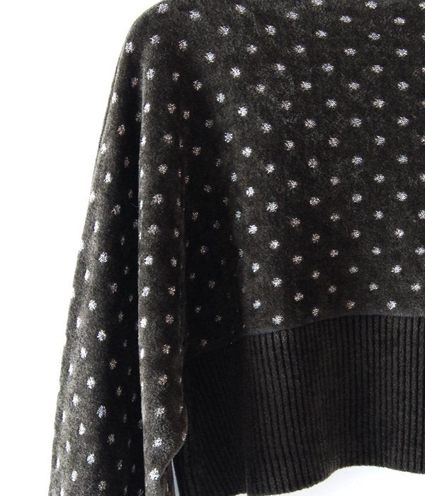 シルバーラメのドットが散りばめられた、コクととろみのある生地で作られたニットボレロ。大胆なショート丈、カットの入った動きの出る袖のデザインと上品な生地感がエレガントな雰囲気を演出。単品使いは勿論、同素材のスカートとセットアップでの着用もおすすめ。