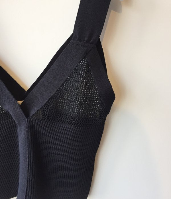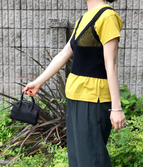 TANのシンボリックアイテムであるニットビスチェ。今シーズンはリブとメッシュのコンビネーションにブラックの縁取りがポイントです。Tシャツやシャツ、ワンピースにレイヤードしたりと幅広く使えて重宝すること間違いなしのアイテム。