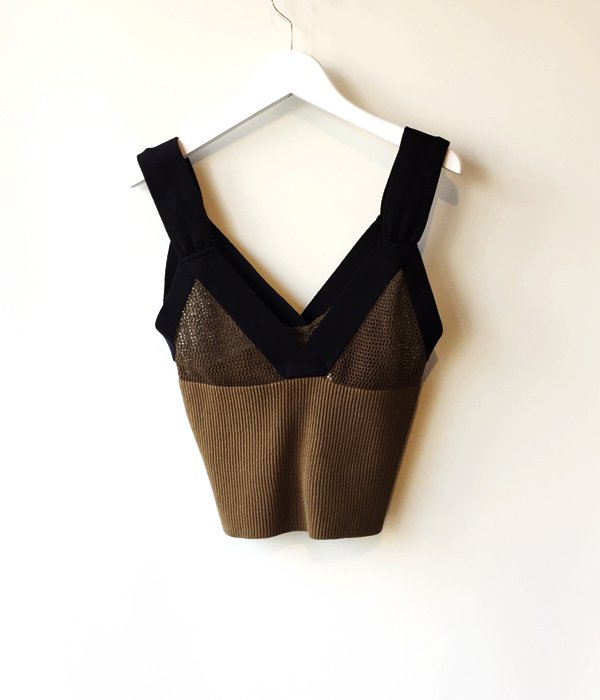 TANのシンボリックアイテムであるニットビスチェ。今シーズンはリブとメッシュのコンビネーションにブラックの縁取りがポイントです。Tシャツやシャツ、ワンピースにレイヤードしたりと幅広く使えて重宝すること間違いなしのアイテム。