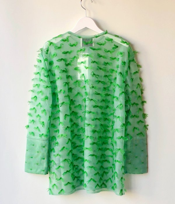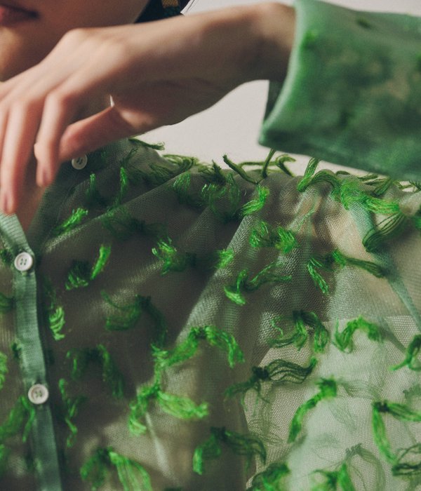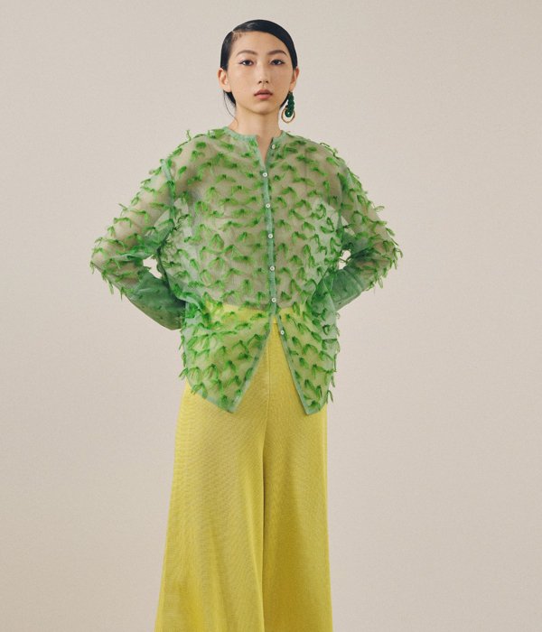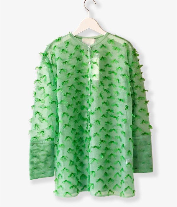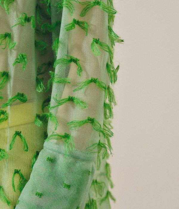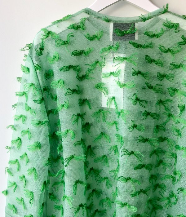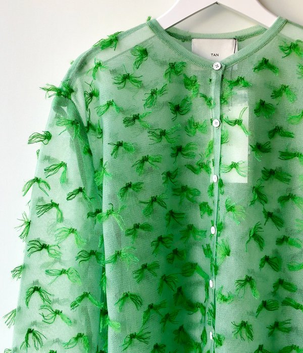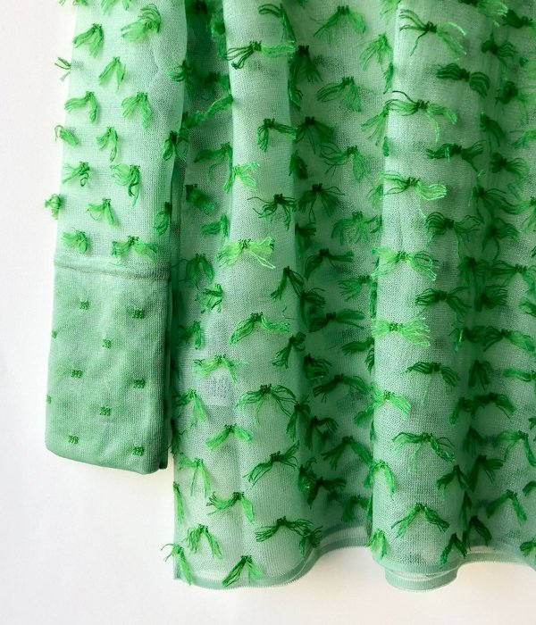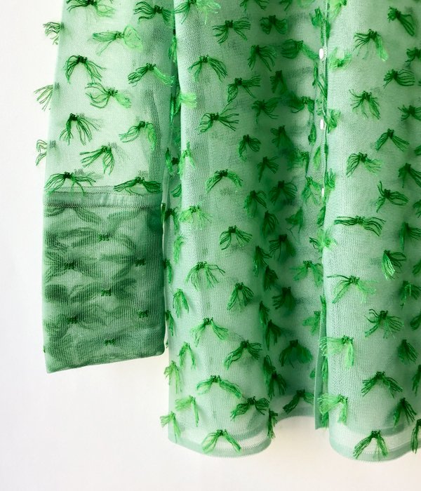 TANからMOHAIR FRINGE SHIRTが入荷しました。ドット状にゴム編みをしていく際に出来る糸のワタリを全て手作業でカットしてフリンジに。シャリ感と光沢のあるナイロン素材のボディに対してフリンジはモヘヤシルクで蝶が舞っているかのようなふんわり感ある仕上がりが面白い。カフス部分はそのフリンジを優しく封じ込めています。
