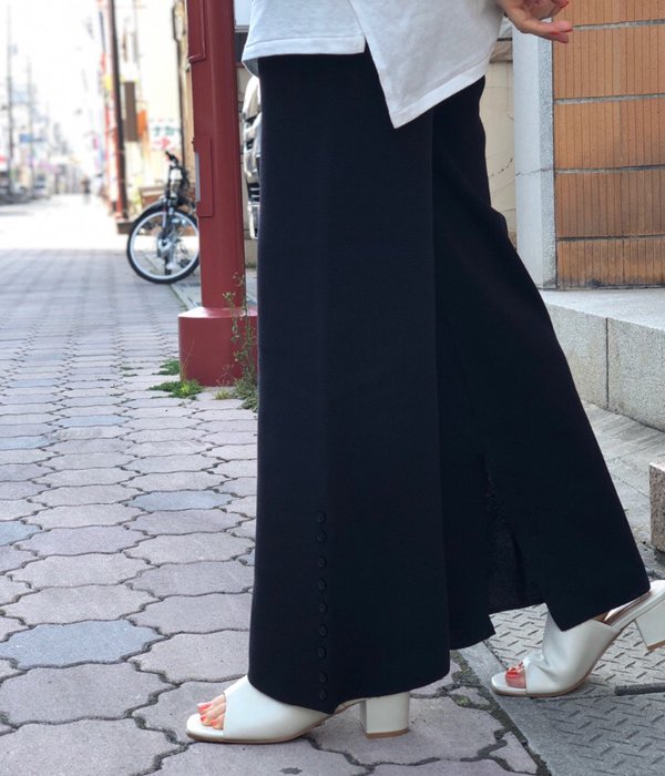 その名の通り、サイドのボタンを留めることでテーパードパンツにもなるニットパンツ。留めずに履くと綺麗なストレートシルエット。内側にスリット入りで足元に軽さを!