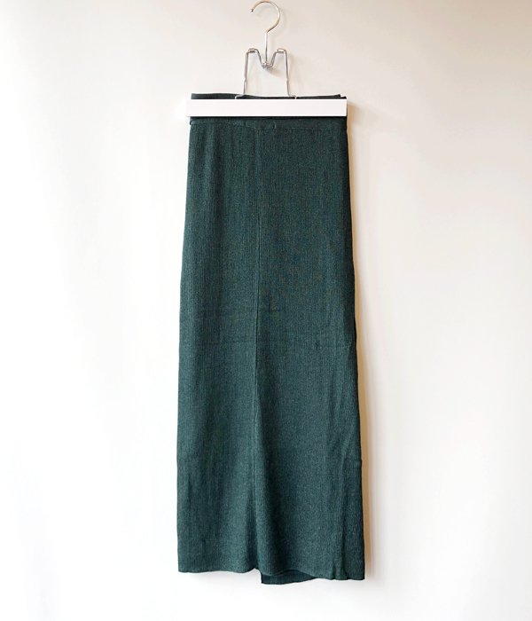 透け感と光沢のある柔らかなニット地のラップスカート。二枚仕立てなのでスリットの位置を調整すれば一枚でも着用可能。またパンツやスカートを重ねて、TANらしいレイヤードスタイルも楽しめます。