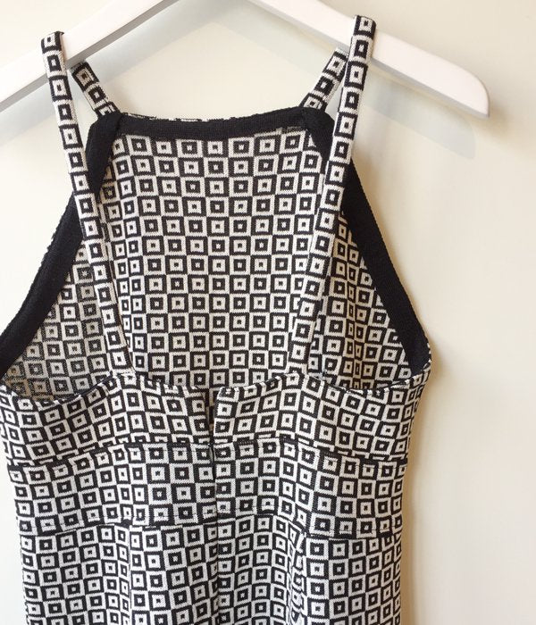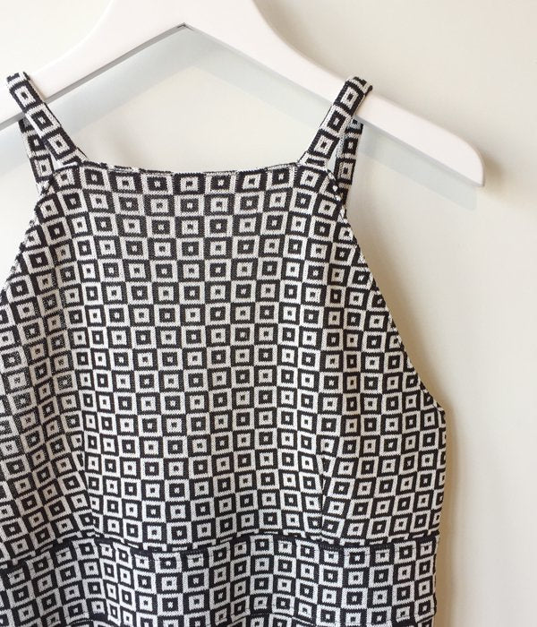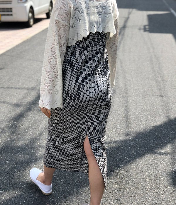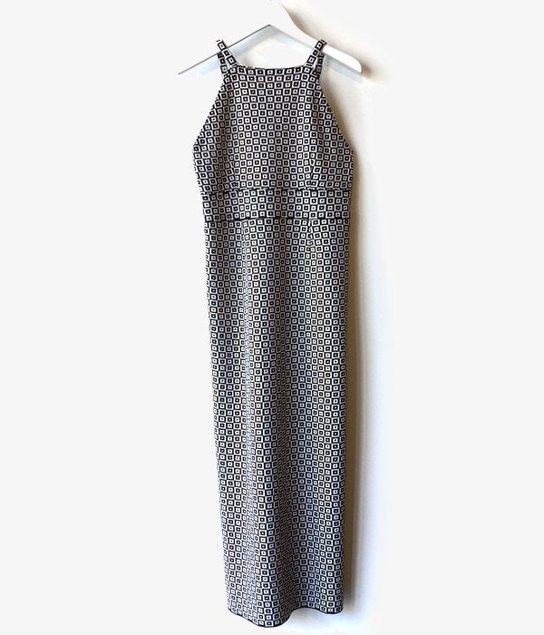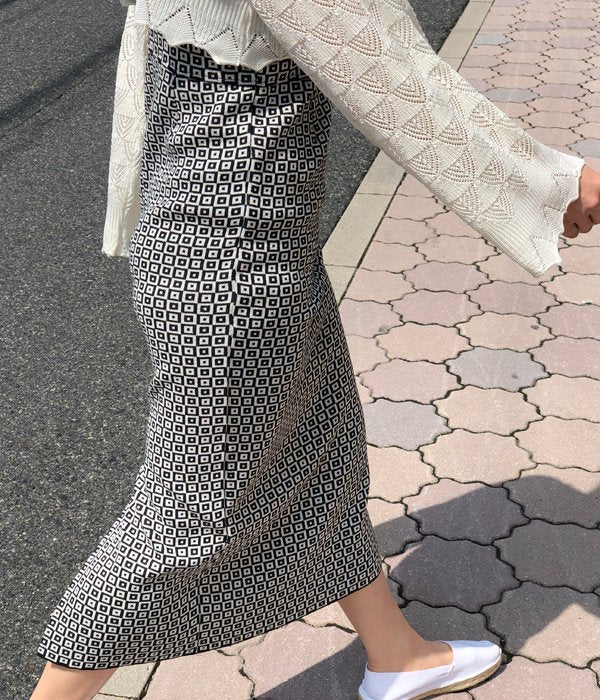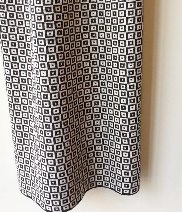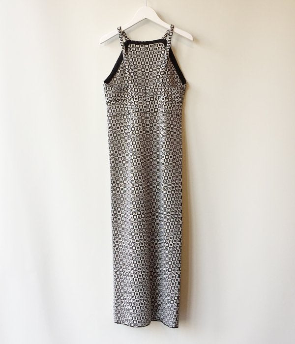 首の詰まったスクエアネックのキャミソール型ワンピース。タイル柄の模様がなんともノスタルジックな雰囲気。後ろスリットが入っていて体に沿うワンピースながらも動きやすく、ニットの柔らかな肌ざわりも感じられる一枚となっています。