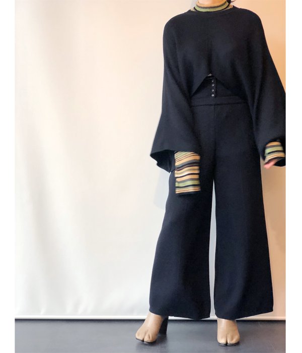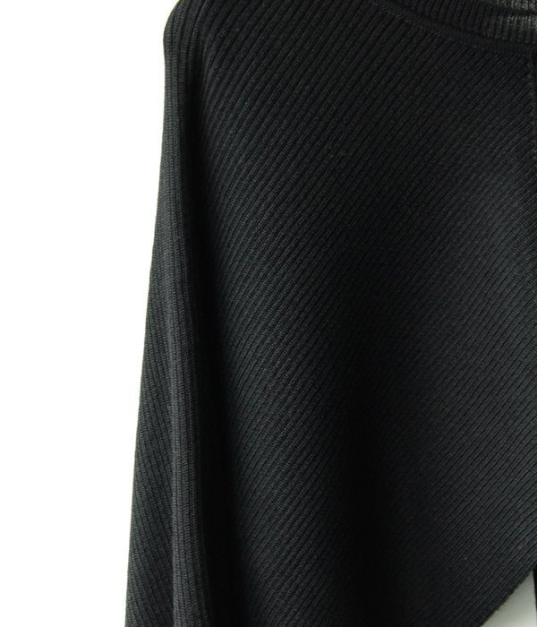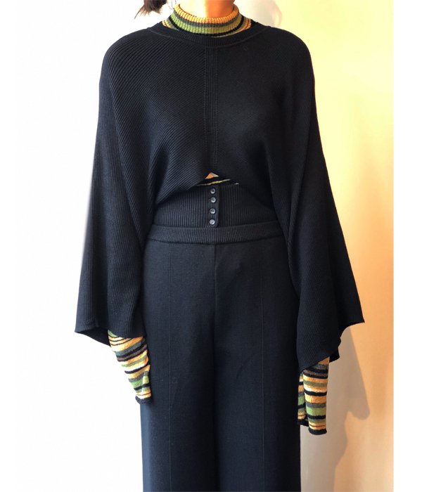 肌ざわりの滑らかなウール糸を使用した、一見ケープの様に見えるプルオーバー。付属のウエストベルトを背中側から前面にぐるっと巻きボタンで留めて着用するデザイン。様々なアイテムにレイヤードし易いゆったりとした着物スリーブがポイント。着こなしのアクセントにおすすめのITEMです。