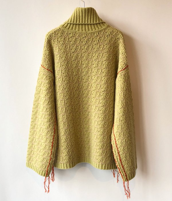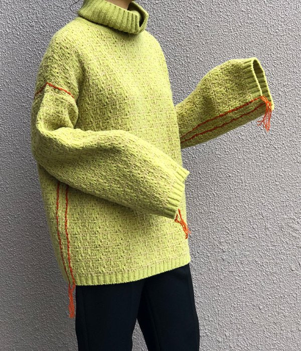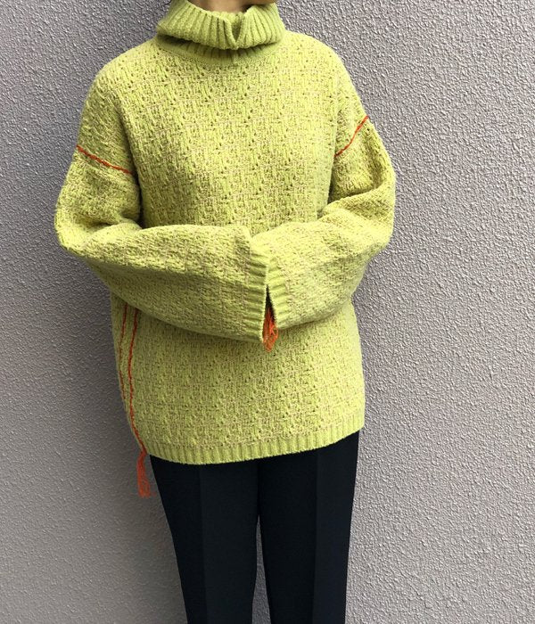 TANからTURTLE-NECK SIDE STITCH PO(YELLOW)が入荷しました。ふわっとした太めの毛糸で編まれたビッグシルエットのニットプルオーバー。LAMBS WOOL100%で抜群のあたたかさです。サイドと袖のカラーステッチがデザインのポイント。ヒップが隠れる丈感でパンツ、スカートどちらとも相性良し。この冬の主役になる一着です。