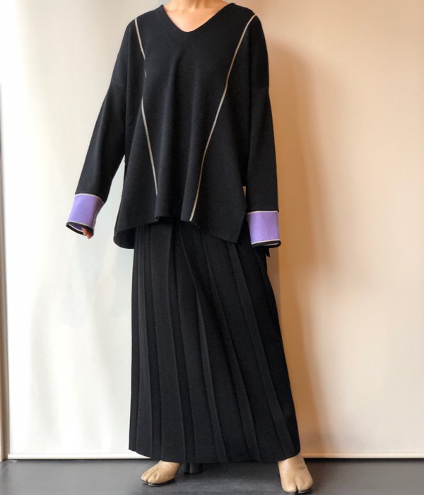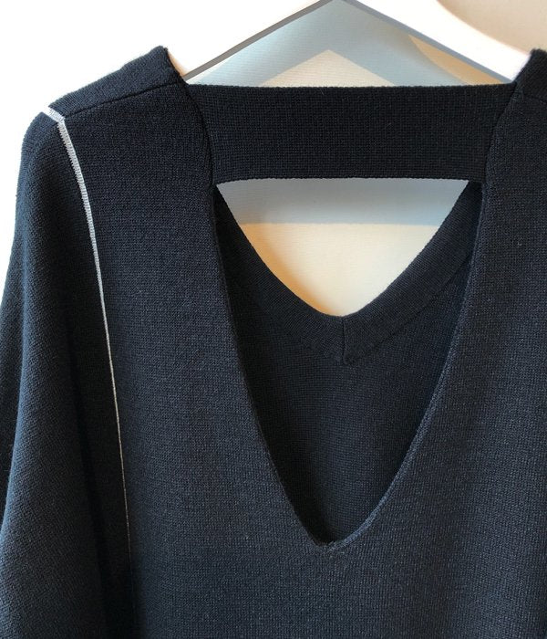 TANからV/N LINE PO(BLACK)が入荷しました。シアー感のあるラインと袖の配色、バックスタイルのデザインがポイントのニットプルオーバー。アンゴラ混で肌ざわりは柔らかく暖かな着心地です。オーバーサイズなシルエットとサイドスリット、背中のV開きで抜け感のある雰囲気に。