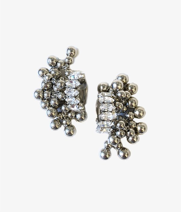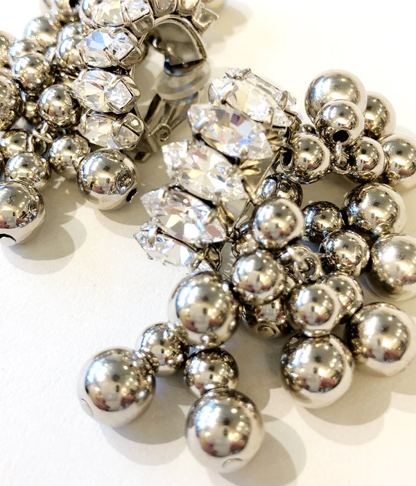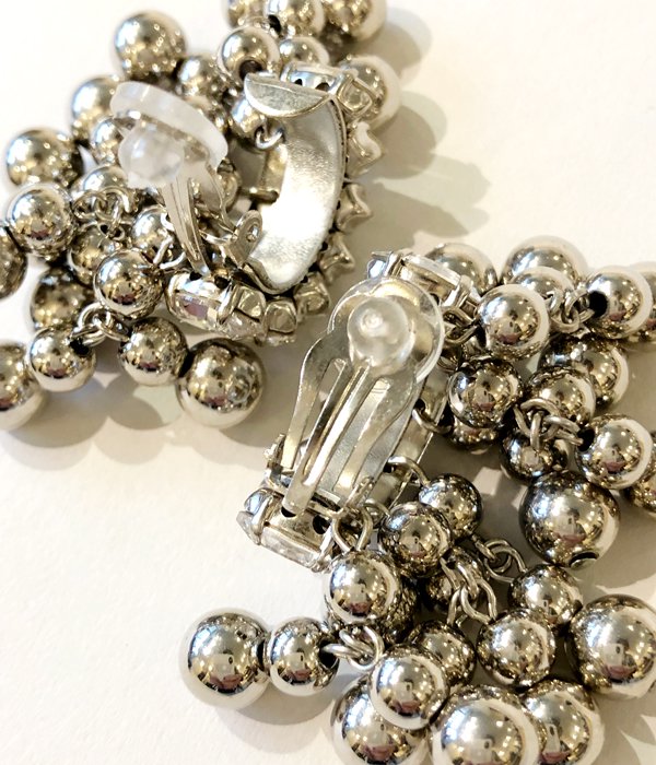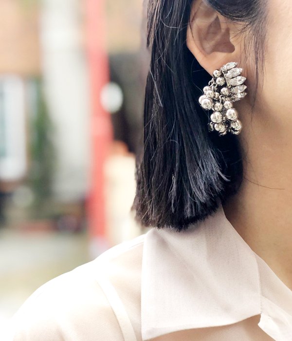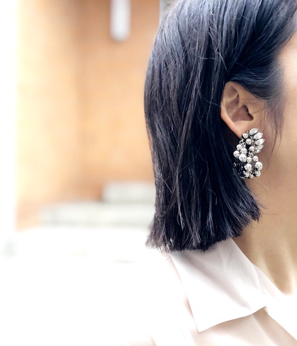 art作品のようなデザインのイヤリング。たっぷりボリューム満点にあしらわれたビーズと、品よく光るストーンが華やかな雰囲気です。ピアスを開けていなくても装着できるイヤリングタイプで、耳たぶが痛くなりにくいクッション付きなのも嬉しいポイント。普段使いはもちろん、パーティスタイルのにもぴったりです。