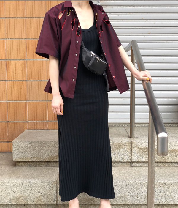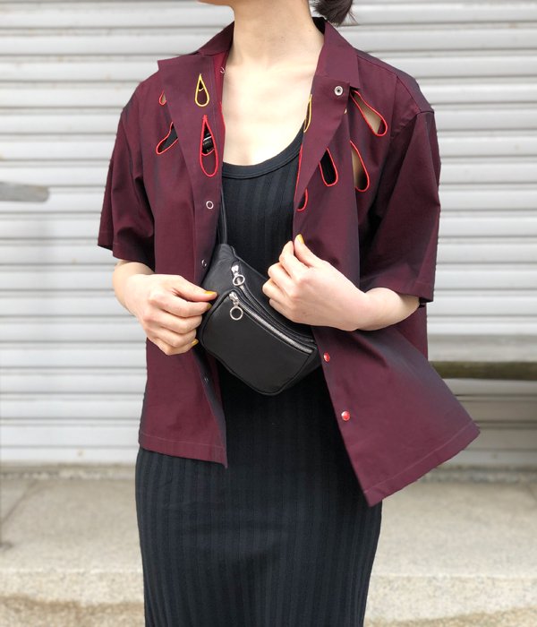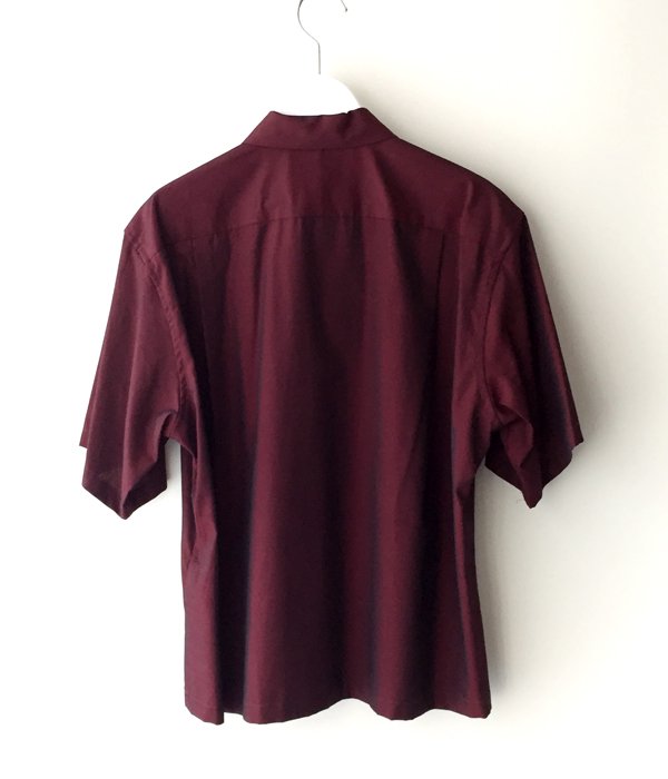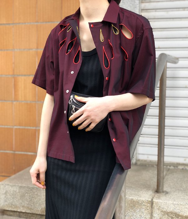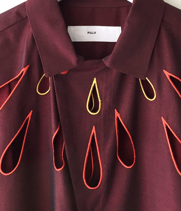 フロントのしずく形穴あき刺繍がポイントのエンブロイダリーシャツ。角度によって偏光する光沢のあるコットン生地に刺繍糸の色とカラーボタンが絶妙なバランスで融合した一枚。第一ボタンを開けて開襟シャツのように着たり、全開で羽織としても着用可能です。