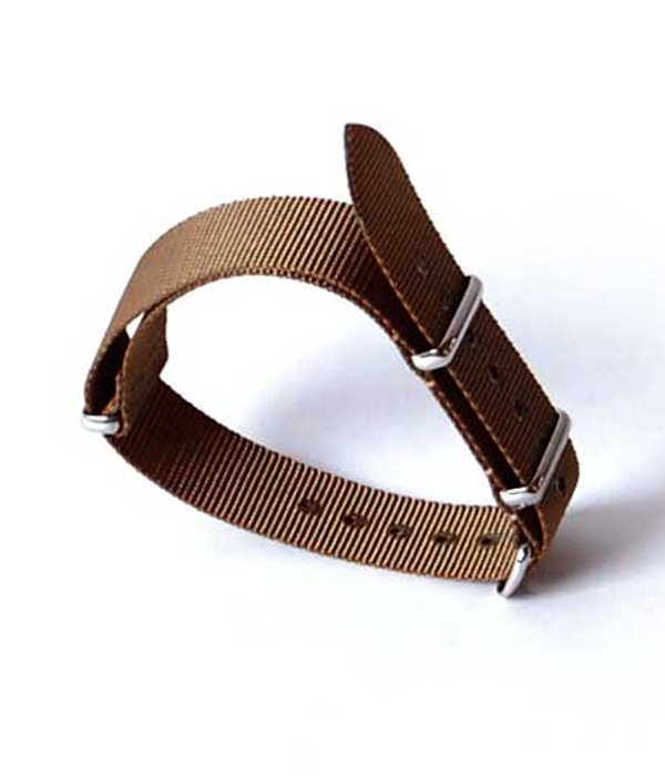 ヨーロッパ某国軍の支給品をモチーフに素材・製法・金具の計上などにこだわって制作した、NATOタイプナイロンベルト。汗などで汚れた場合も洗濯でき、色違いでセレクトするのもオススメ。一緒に紹介しているナイロンベルト、「Guidi&Rosellini社」のレザーを使用した台座、ムーブメントを自分好みのカラー、パーツで制作できるのも魅力の一つ。