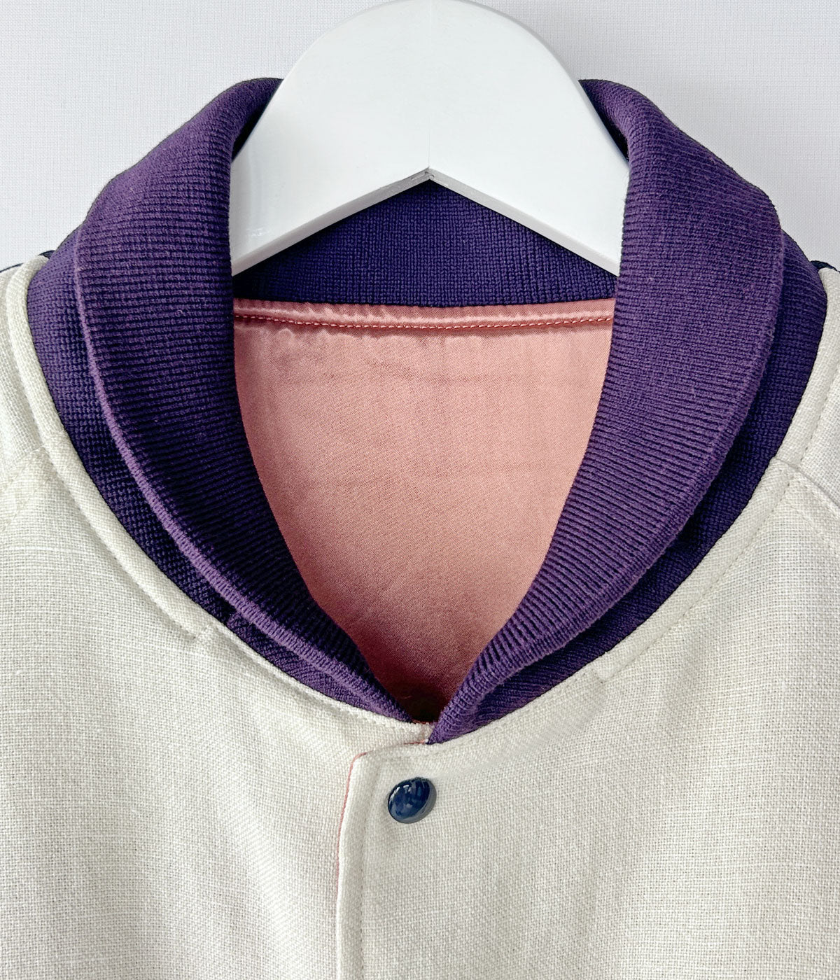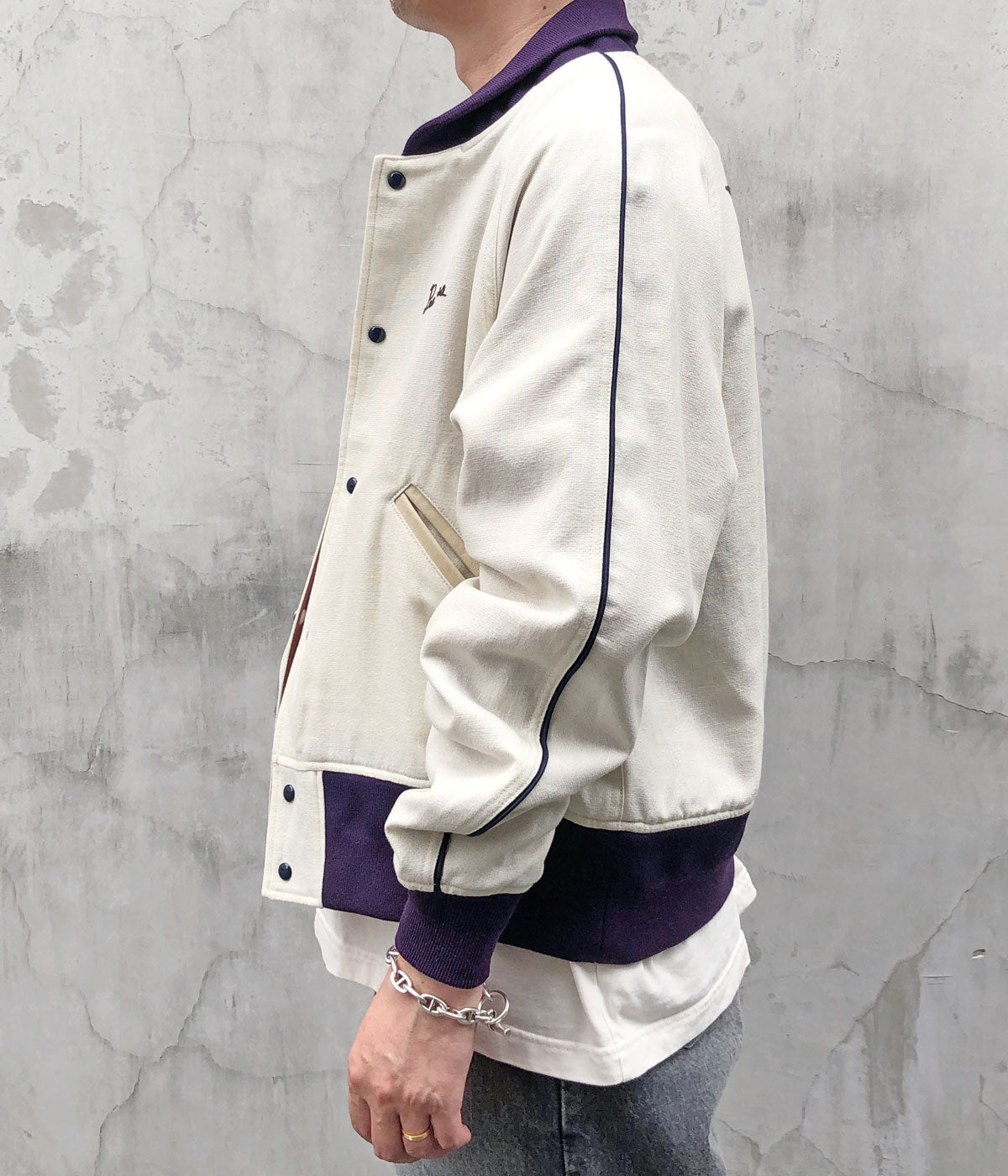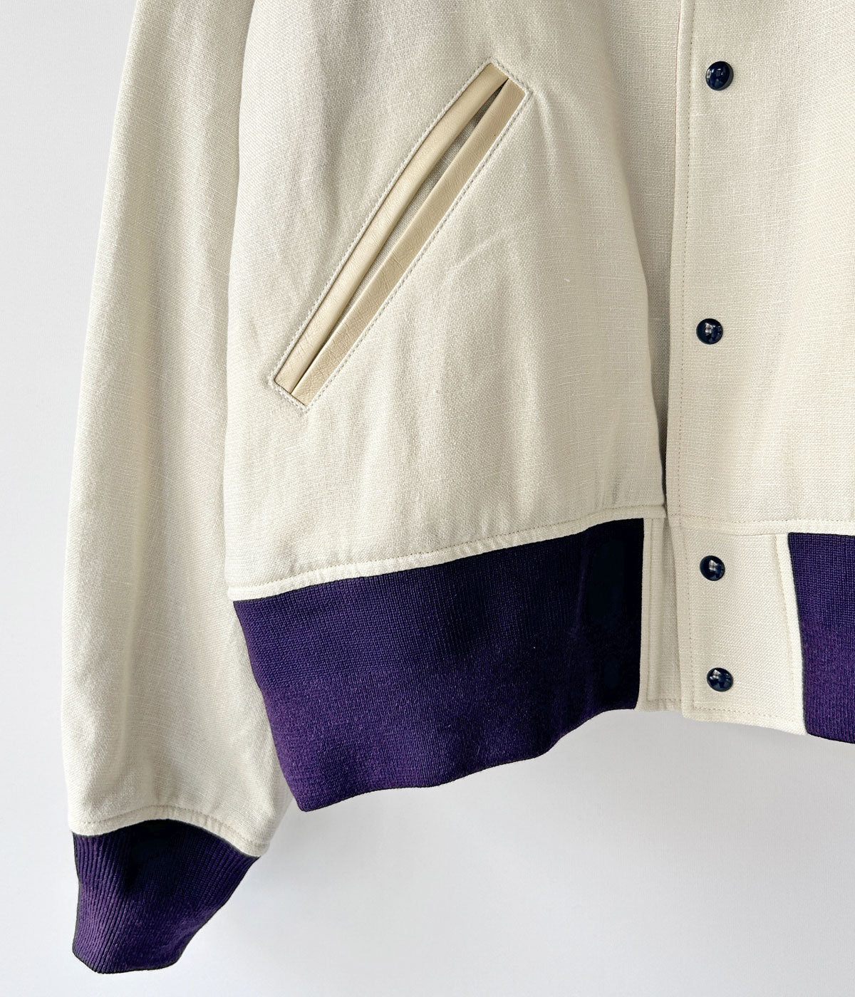 visvimから、BALLARD VARSITYが入荷しました。毛と麻で織り上げたブラッシュ加工した生地を使用したバーシティジャケット。ラグランスリーブ、肩から袖口にかけてパイピングテープが挟み込まれたデザイン。リバーシブル仕立てで両面異なる雰囲気で楽しめます。各所のハンドル刺繍によるディテールがポイント。