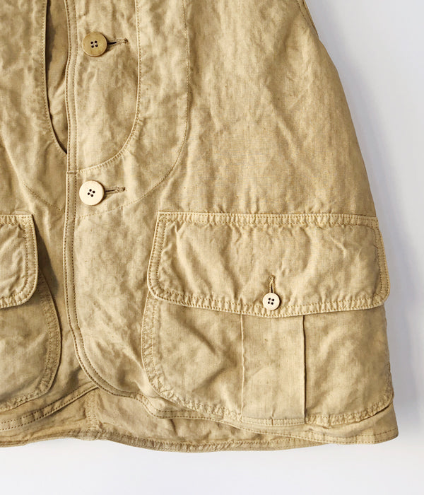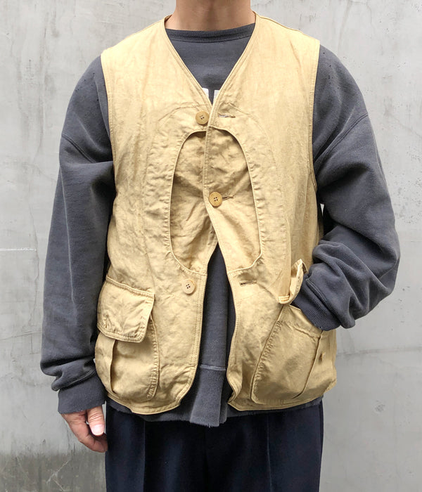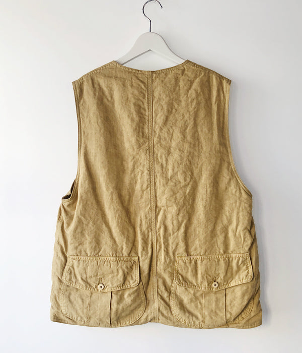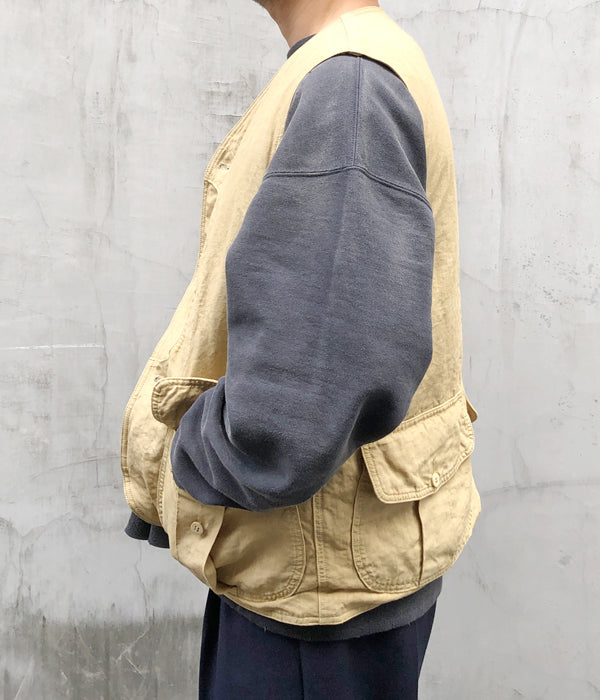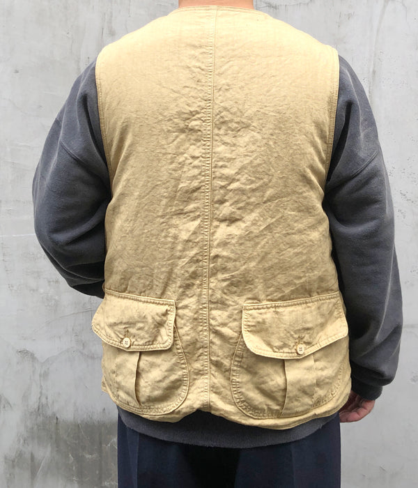 visvimから、GUSTO DOWN VESTが入荷しました。細番手の麻を高密度に織り上げた生地を使用したダウンベスト。上質なホワイトグースのダウンを使用し保温性も高く、オリジナルの水牛ボタンが高級感を演出。前後に大きなフラップポケットを携えたデザイン。