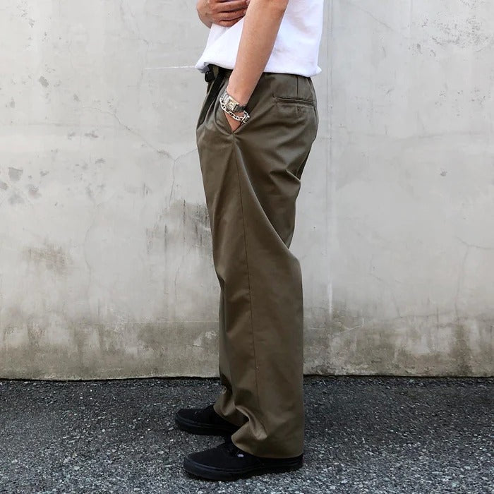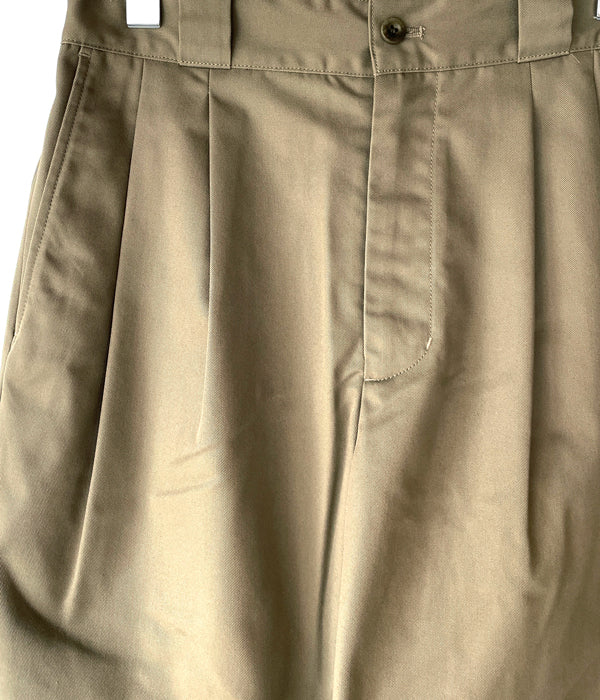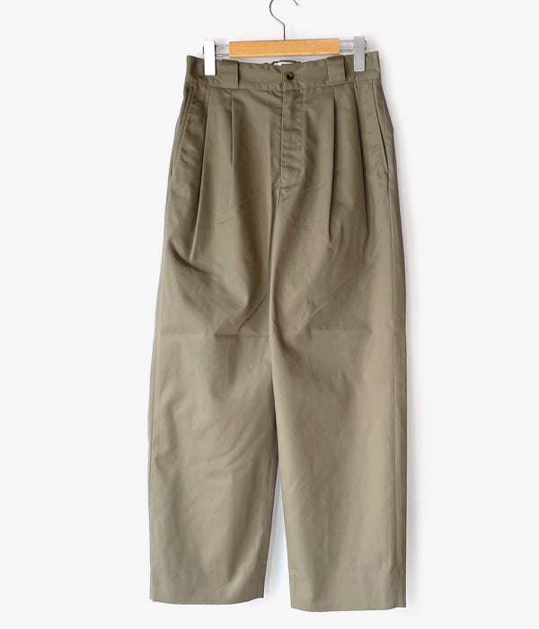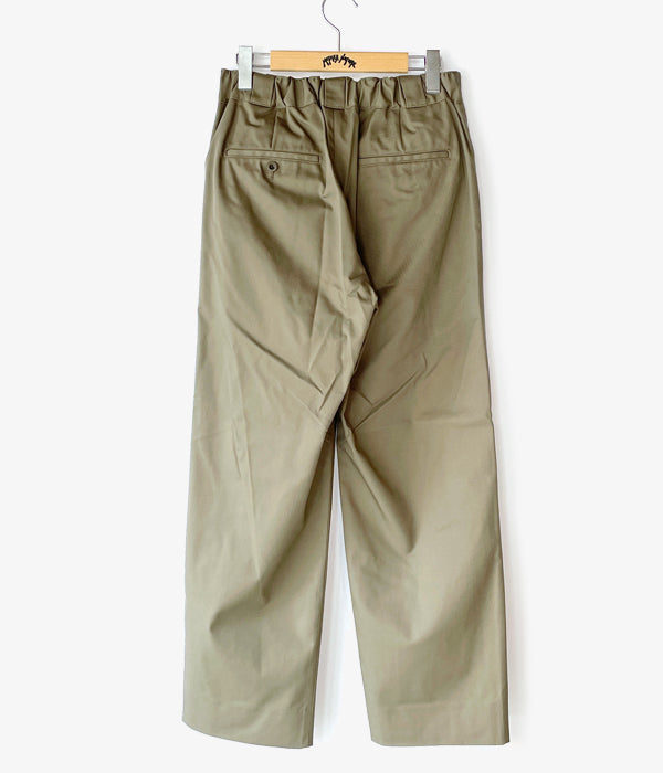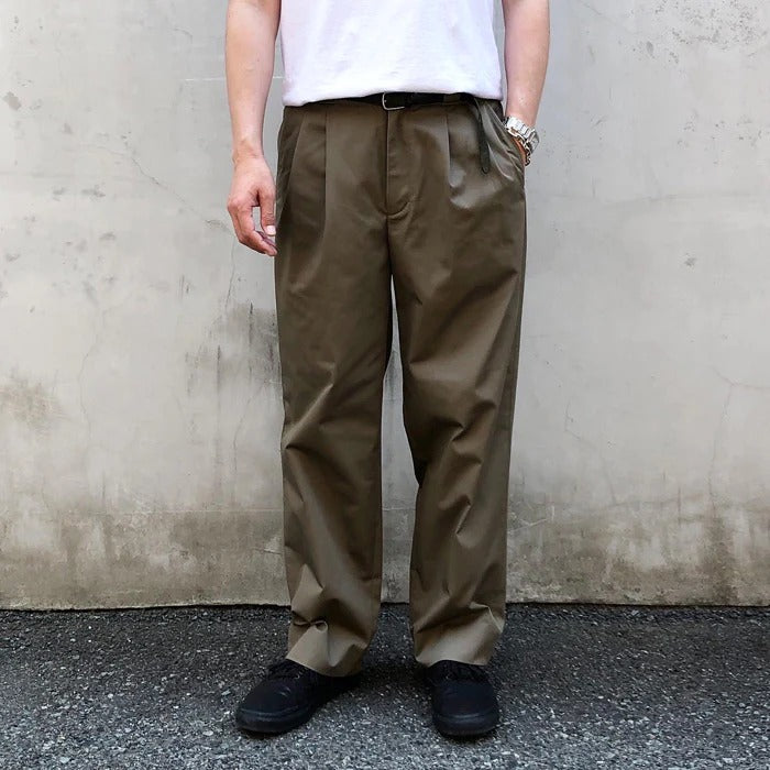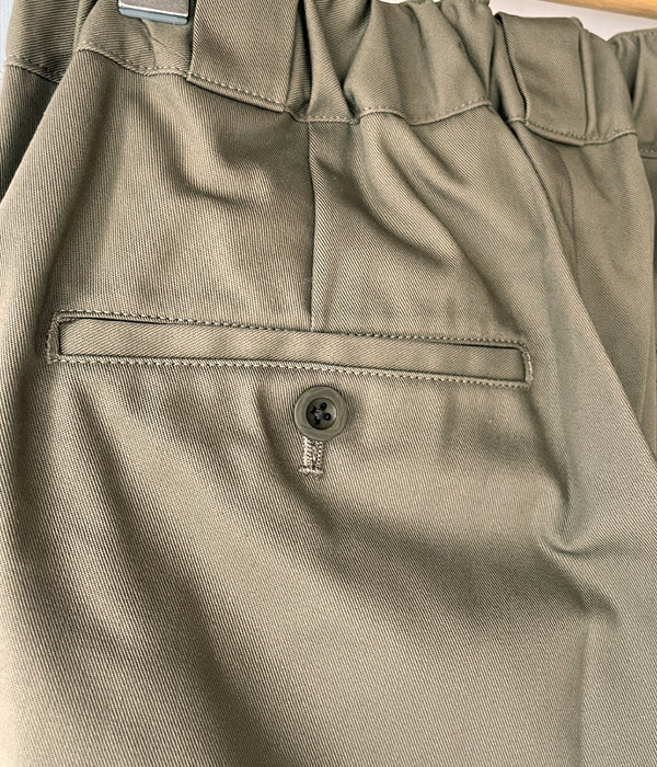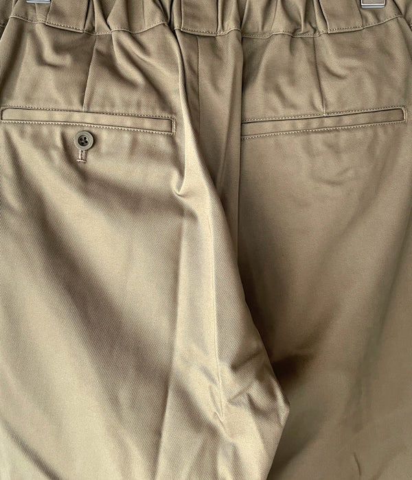 WELCOME-RAINから、RUBBER BACK PANTSが入荷しました。ポリxコットンのミックス素材を使用した光沢のある表情のツータックパンツ。裾に向かって緩やかなテーパードしたシルエット。ウェスト周り背面にのみゴムを仕込んだ(RUBBER BACK!!a)楽な着用感がありがたく、幅広のベルトループがワーク感を演出しつつも、全体的にとてもきれいな汎用性の高いワードローブ然とした1着。