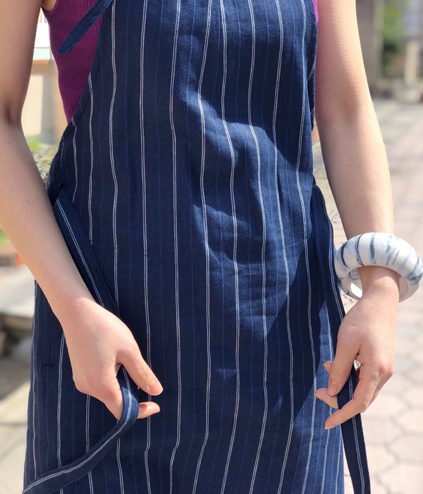 エプロンからインスピレーションを受けたラップ型ドレス。青を基調としたマルチストライプ柄とリネンの素材感がマッチした仕上がり。