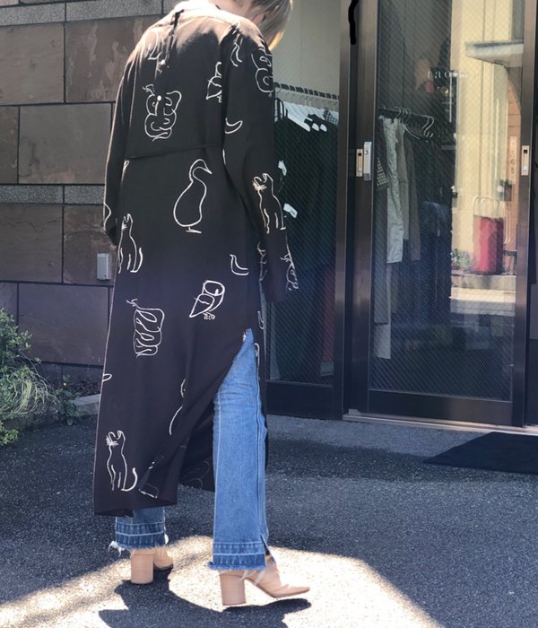 滑らかなシルク混レーヨン地のバックプラケットタイプのロングプルオーバーシャツ。クラシックなデザインとユニークなドローイング柄がマッチした雰囲気ある一枚。ウエスト紐でブラウジングしたり、前後ボタンの開閉で着こなしに変化をつけられます。