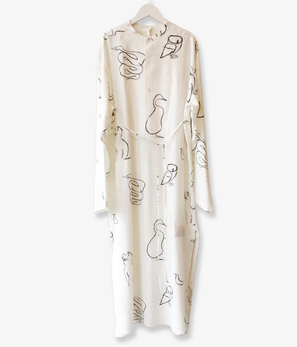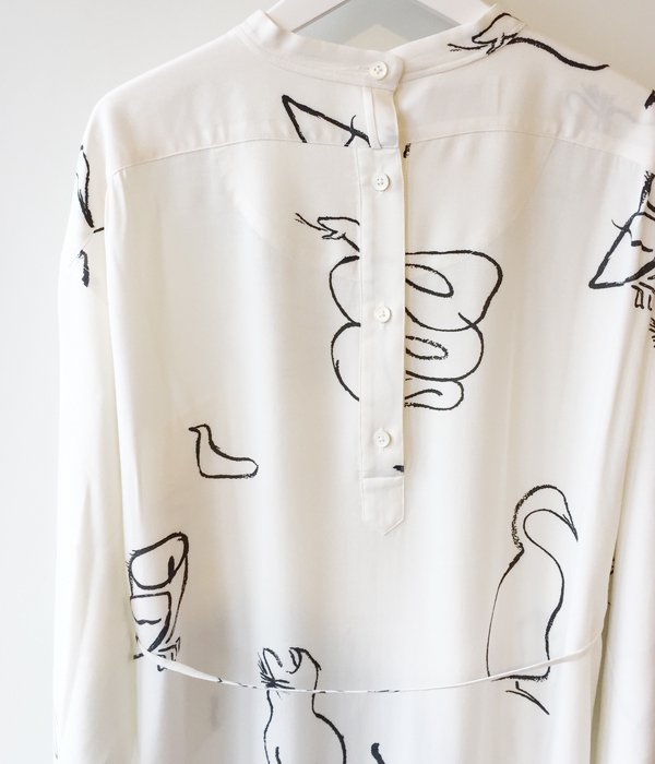 滑らかなシルク混レーヨン地のバックプラケットタイプのロングプルオーバーシャツ。クラシックなデザインとユニークなドローイング柄がマッチした雰囲気ある一枚。ウエスト紐でブラウジングしたり、前後ボタンの開閉で着こなしに変化をつけられます。