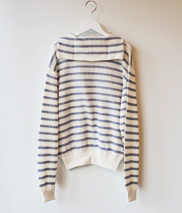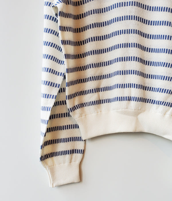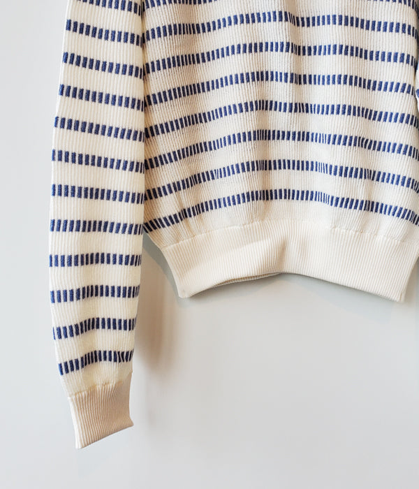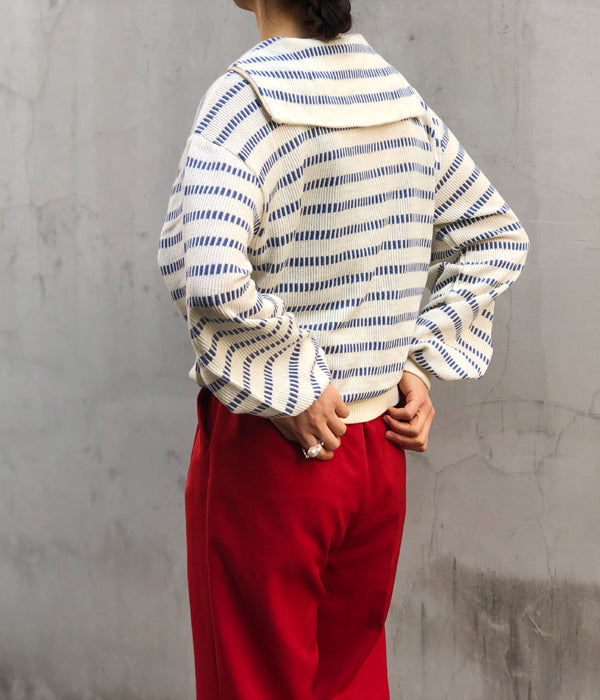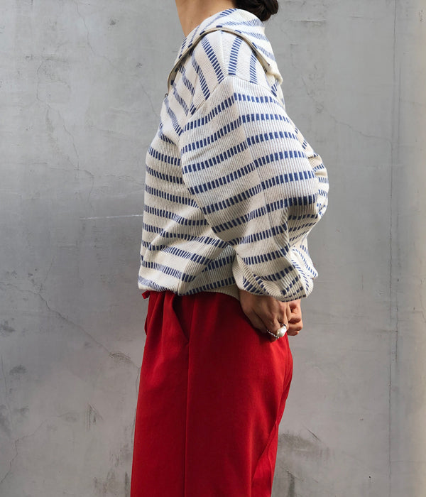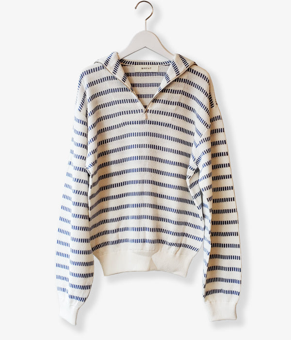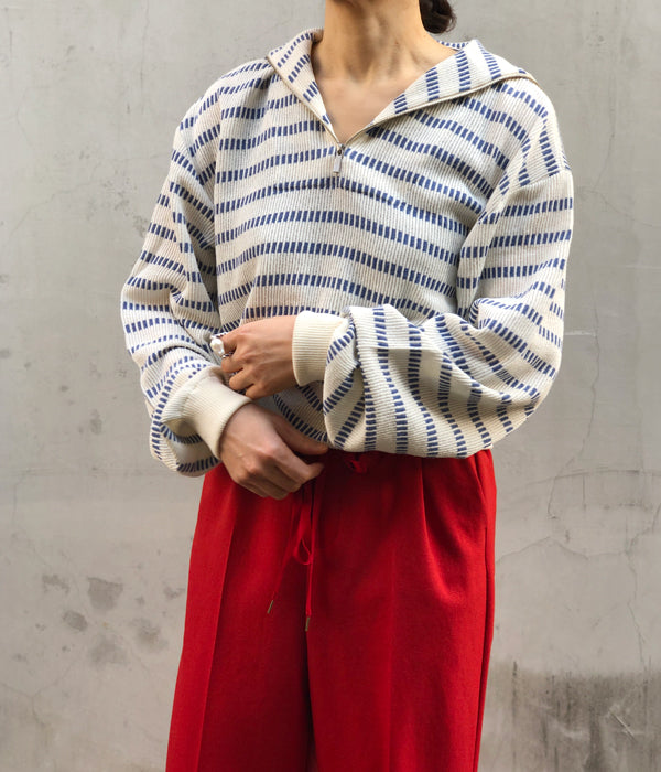 WRYHTからBASQUE HALF ZIP TOPが入荷しました。ニットバスクの編み地を使用したハーフジップトップ。どことなく現代ではあまり感じることの出来ないノスタルジーさを持っています。ショートレングスが新鮮で幅広い着こなしが楽しめそう。