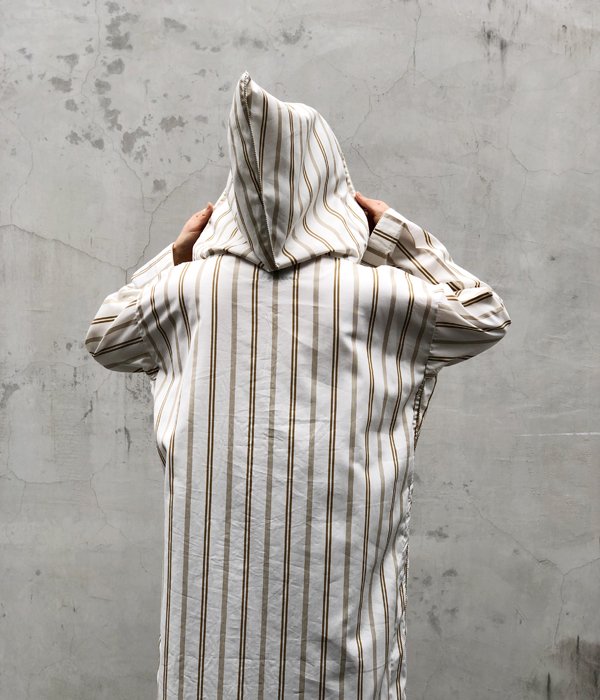 WRYHTからCONE HOODED MAXI TUNICが入荷しました。イスラム圏の男性用の民族衣装からからインスピレーションのフーディチュニック。民族衣装ならではの直線的なパターンやシーム部分のパイピング、被った時に魔女のようなミステリアスで独特なシルエットになるフードのデザインが特徴的。化繊ブレンドのコットンストライプの生地はシャリっとした肌ざわりで暑い日でも快適な着心地です。