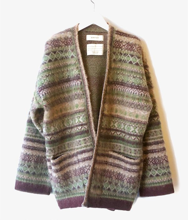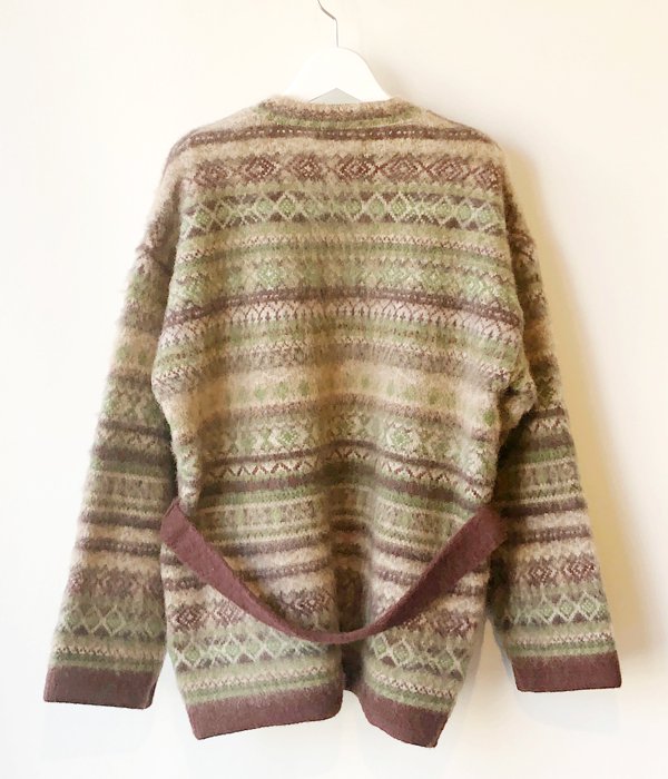 WRYHTからFAIR ISLE BELTED GAWNが入荷しました。モヘアとカシミア混ウールを使用し編み上げたベルテッドガウン。 ジャガード織りで仕上げた伝統的なシェットランド柄には手作業で起毛加工が施され、独特の表情を見せています。軽さの上に保温性も確保し、アウターとしても着用可能となっています。