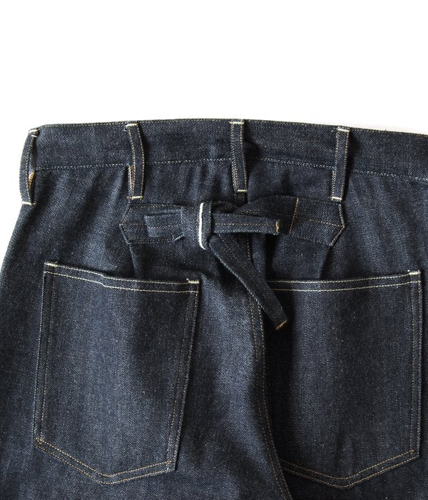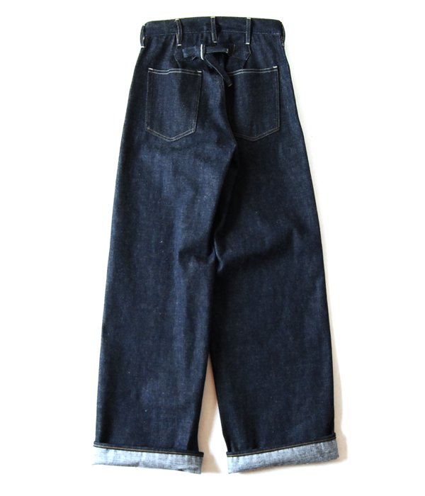 バックのノットがユニークかつフェミニンな印象を与えるワイドデニム。オリジナルのセルビッチデニムを使用しています。ロールアップスタイルまでカバーする絶妙な丈感に仕上げました。