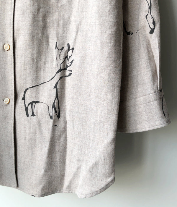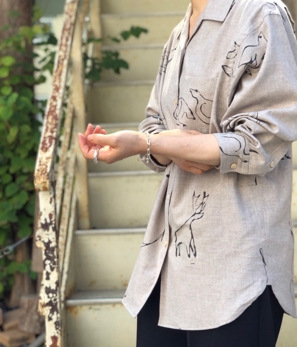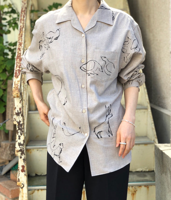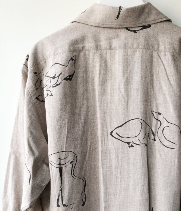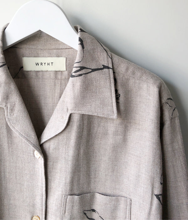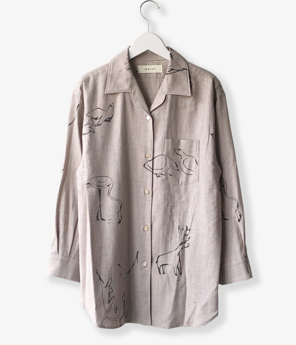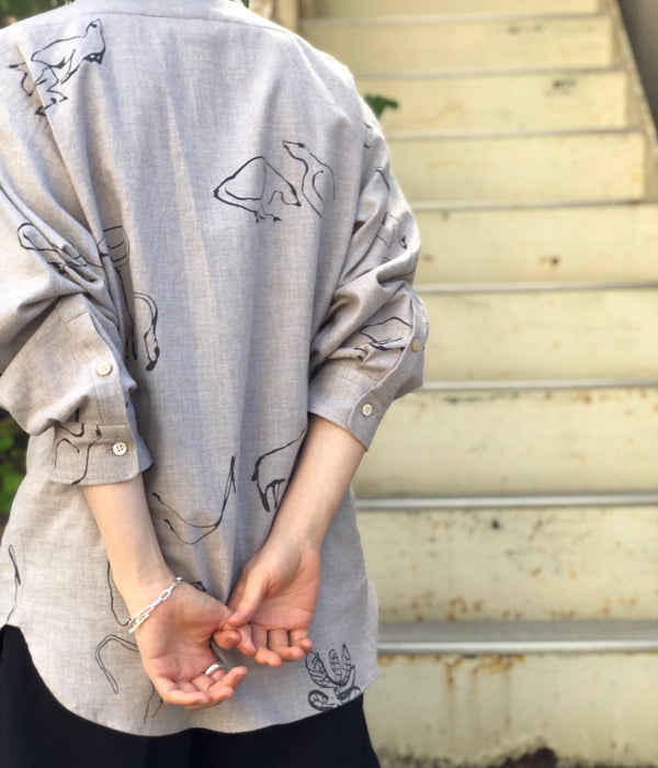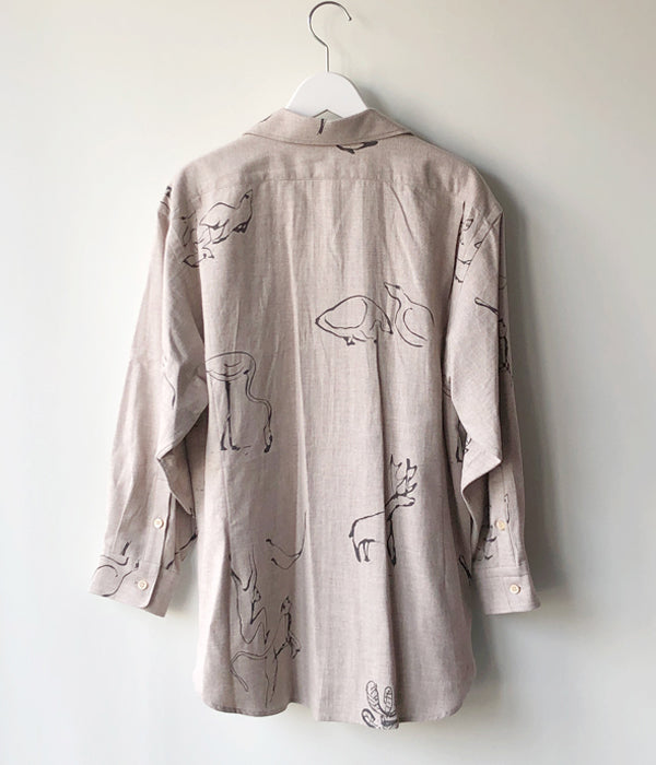 WRYHTからONE-PIECE COLLAR BLOUSEが入荷しました。台襟のない一枚つづきの襟回しのオープンカラーシャツ。WRYHTのシグネチャーデザインの一つでもあるドローイングテキスタイルシリーズです。今シーズンのモチーフは22SSに続きアニマルパターン。コットンフランネルの生地感と、繊細な線で描かれた動物達がとてもユニークな仕上がり。
