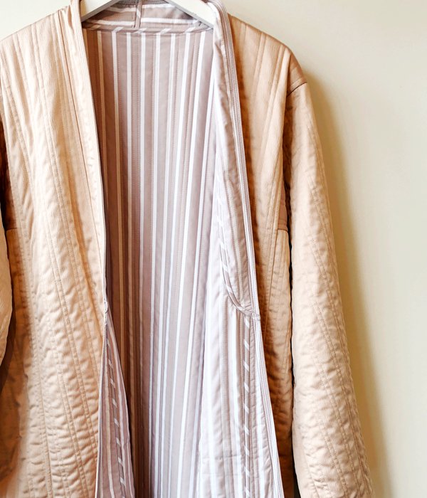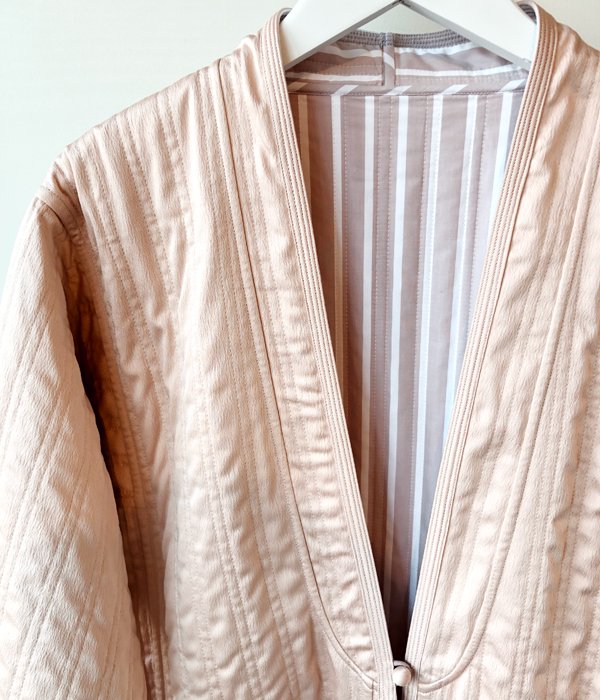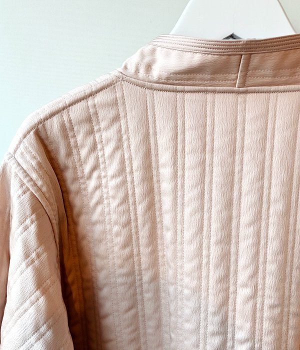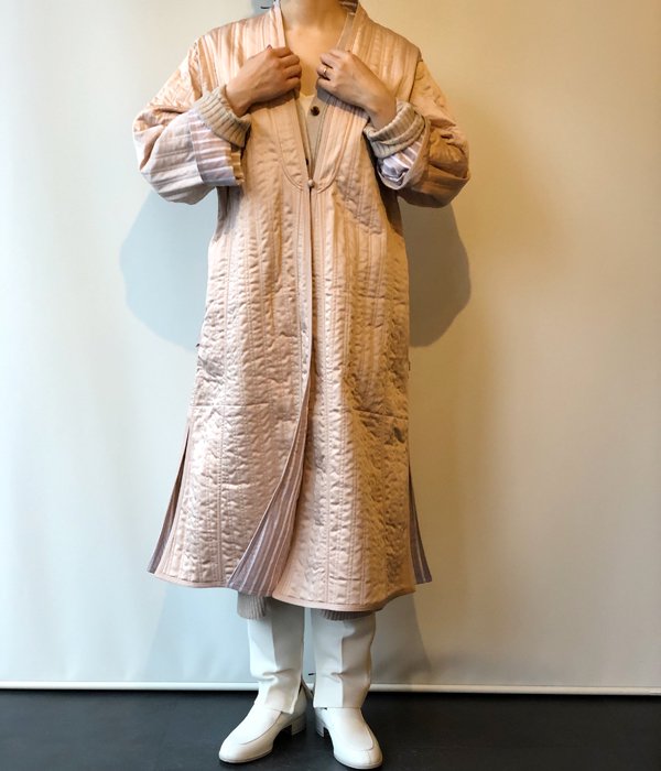 WRYHTからREVERSIVLE QUILT GAWN(CORAL)が入荷しました。ヨーロッパの伝統的なナイトガウンから着想のリバーシブルガウン。生地の表面に凸凹をつけたサテンの裏にシャツ地を合わせ、シームには全てテープ始末を施し一枚仕立てで縫製。この特徴的且つユニークなパターンやディテールはWRYHTならでは。裏と表で雰囲気がガラリと変わる、感度の高い一着となっています。