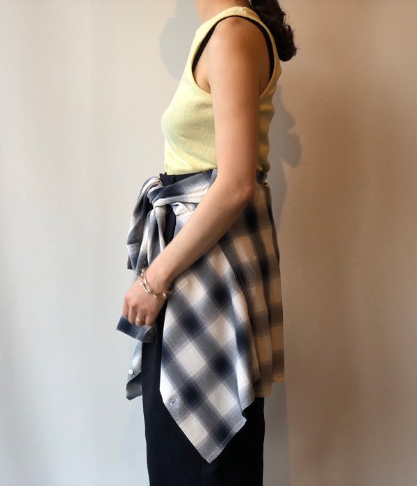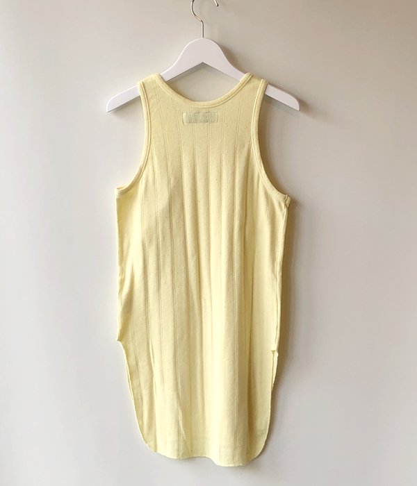 WRYHTからROUND-NECK RIBBED TANK(CITRINE)が入荷しました。ピリングした風合いの針抜きフライスがどこか懐かしく、製品染めされた雰囲気のあるカラーリングが特徴的なタンクトップ。着古した感がありながらも古着とは違う、とてもユニークな一枚です。