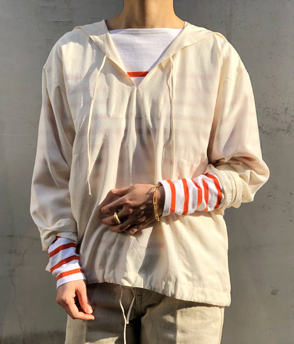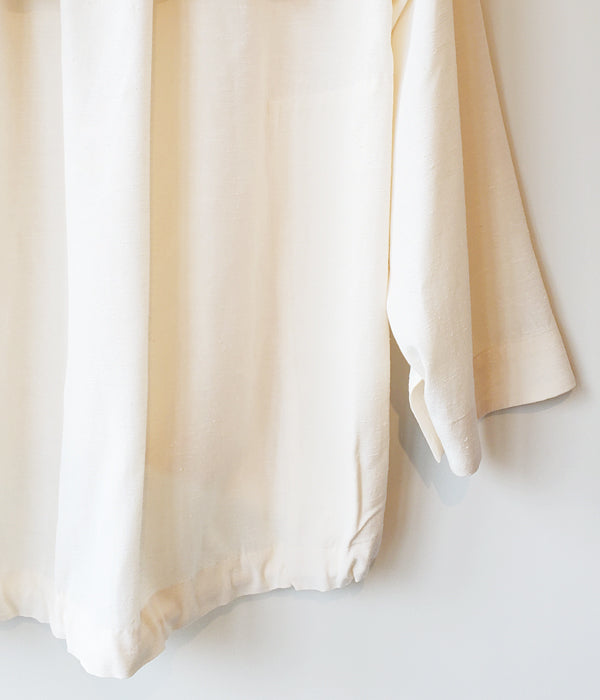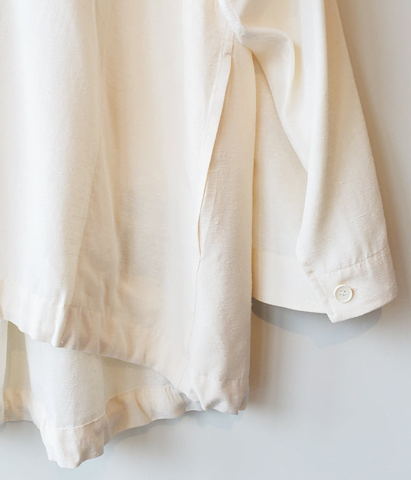 WRYHTからSAILOR COLLAR SMOCK TOPが入荷しました。ミリタリーアーカイブからインスピレーションのセーラースモック。襟元が開くように設計された大きめのセーラーカラーやギャザーを配しネック、たっぷりとしたシルエットがポイント。ワイルドシルクネップが目を引く生地は清涼感があり、綺麗なドレープから生まれるエレガントな表情を持っています。