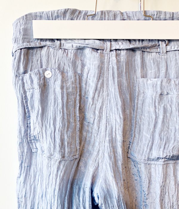 WRYHTからSTRING WAIST TROUSER(AZUR)が入荷しました。膝から裾にかけてズドンと落ちるエレガントなラインと、ウエストで縛るディテールが特徴の定番ワイドトラウザー。今シーズンは光沢とシワのある生地を採用し独特の雰囲気に仕上がっています。オリエンタルロングジャケットとセットアップでの着用は勿論、単品でも着まわしのきく一本となっています。